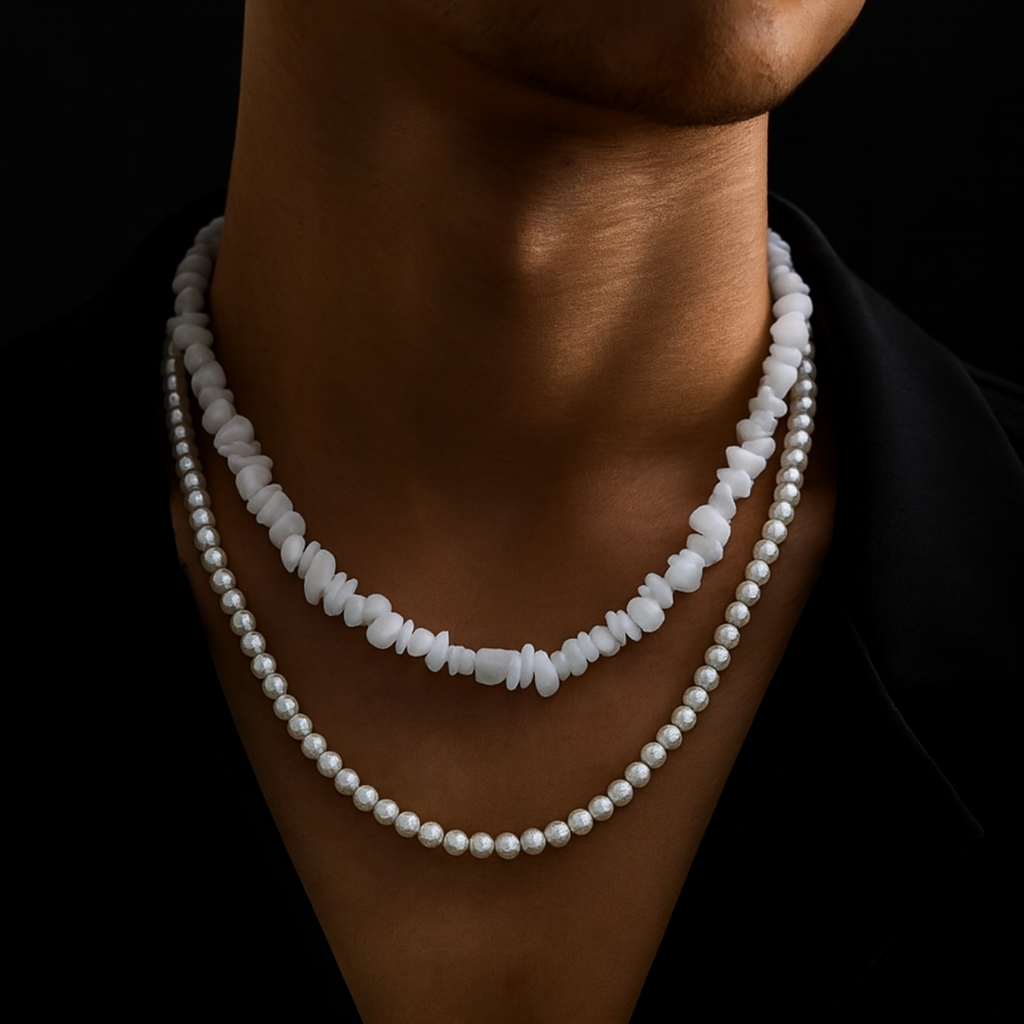 The Eros Set combines the raw texture of natural stone with the timeless elegance of lustrous pearls a perfect harmony of edge and sophistication. Designed for the expressive and the bold, this dual-layer necklace evokes effortless luxury with a touch of rebellion.